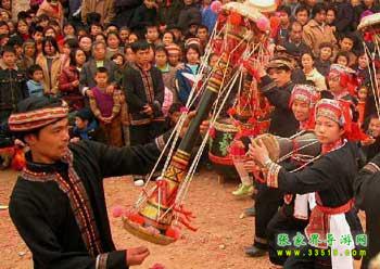 仗鼓舞是張家界市桑植縣白族獨有的一種民族舞蹈。 仗鼓舞以“仗鼓”作道具,與朝鮮族鼓舞有異曲同工之妙。 鼓長1.2米,兩頭大如碗口, 用皮革繃面, 中細可握,形如木杵。相傳南宋末天寶年間,有谷、王、鐘三姓兄弟在蒙將兀良合臺“寸白軍”服役,后“寸白軍”被遣散,三人即從云南大理流落至桑植定居。某年臘月,白族兄弟們正在打糍粑準(zhǔn)備過年,一幫官兵突然圍寨抓人,白族人即用粑粑杵奮起反擊,將官兵打敗,白族人為慶賀這一仗的勝利,就以木杵作道具跳舞作樂,這便是仗鼓舞的由來。后來,白族人將粑粑杵改成鼓,配以笛子、嗩吶、大號和鑼、鈸、罄等鳴樂伴奏,同時創(chuàng)造了八十一套舞蹈動作,成為一種獨具風(fēng)格的民間舞蹈。