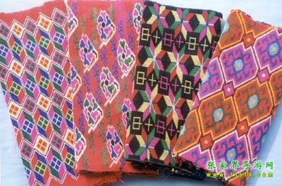 織錦。又名西蘭卡普土花鋪蓋,為土家族傳統(tǒng)工藝品之一,是森林公園工藝品廠的主要產(chǎn)品??楀\是在特制的本質(zhì)織機(jī)上以錦紗為經(jīng)、五彩絲線為緯、手工提花織成。以其質(zhì)地厚實(shí)、堅(jiān)韌,色彩鮮艷,格調(diào)古樸,流暢生動(dòng)著稱。圖案有花草、鳥(niǎo)獸、生產(chǎn)、生活、幾何、字樣等種類。為舊時(shí)土家姑娘必備嫁妝之一。據(jù)考證,早在漢代,土家織錦就作為方物貢入漢室宮廷。20世紀(jì)后,土家織錦曾漂洋過(guò)海至日、美、英等國(guó)展出,并作為禮品,被國(guó)家領(lǐng)導(dǎo)人贈(zèng)送給外國(guó)元首及政府官員,如今織錦以壁掛、枕巾、沙發(fā)墊、桌圍、提袋、服飾等多種式樣遠(yuǎn)銷世界各地。