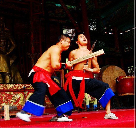 大庸氣功 大庸氣,堪稱武林奇葩,曾為祖國贏得聲譽(yù),海內(nèi)外享有極主名望。 大庸氣功是大庸各民族特別是土家族傳統(tǒng)體育項 目之了,分健體氣派、武術(shù)氣功兩類。前者有“返還 功”、“馬王推氣功”、“少林達(dá)摩醫(yī)療保健氣功” 等;后者有靜坐、壁虎、靈子、二指彈、碎石、松靜 、硬氣、五禽、五陽功等,尤以硬氣功著稱。大庸硬 氣功,歷史悠久,漢代相單程,明代覃后,清代劉明 燈,當(dāng)代湯子模、周鐵鞭、杜心武、趙繼書等都具有 超人硬氣武功。大庸土著民族在漫長的反征服、反壓 迫斗爭,博采武當(dāng)、少林南北派、昆侖派眾家武林精 華,創(chuàng)造出獨此一家的大庸硬氣功。 據(jù)傳,大庸硬氣功鼻祖是楚國鬼谷子?!?a class="insidelink" href="http://m.peiruman.com/cityinfo/15580531721.html" title="永定區(qū)">永定縣 志》有關(guān)鬼谷子隱居天門山鬼谷洞潛心學(xué)《易》、傳 授方術(shù)的記載。到清代有武林高手朱茂嶺,隱居三岔 村北芭蕉灣洞,研究鬼谷氣功之術(shù),后收西溪坪胡口 子、余世萬(即“余通人”)為徙,傳其衣缽。余通 人將武術(shù)氣功系統(tǒng)整理,發(fā)揚(yáng)光大,播名于世。 新中國成立后,黨和政府十分重視民間氣功發(fā)掘 整理,并正式列為體育項目加以普及發(fā)展,今日大庸 市習(xí)練硬氣功達(dá)數(shù)萬人眾。永定區(qū)官黎坪村世有“硬 氣功之鄉(xiāng)”盛譽(yù),該村男女老幼,練功已蔚成風(fēng)氣, 其武師趙繼書,1979年先后參加全省和全國武術(shù)大賽 ,均獲一等獎,受到國家體委重視,同年7 月趙繼書 專程到北京給中央領(lǐng)導(dǎo)同志匯報表演。嗣后,隨同中 國武術(shù)代表團(tuán)和國家領(lǐng)導(dǎo)人先后兩次出國,到盧森堡 、意大利、比利時、羅馬尼亞、馬其他和東南亞等國 家訪問。他表演的臥刀碎石、頭頂開石、雙鳳灌耳、 頭碰石柱、叉尖推磨等精彩節(jié)目,博得外國友人好評 。盧森堡一位榮獲國家獎牌的武士,看了表演后連夜 來到中國大使館,將自己珍藏多年的獎牌贈送給他; 盧森堡國王主動熱情走上臺與趙繼書熱情擁抱,連連 稱贊:“了不起!了不起!國際氣功大師!”并把珍 藏紀(jì)念章一枚贈送給趙繼書。一位法國朋友十分贊賞 說:“中國的氣功,稱為全人類的寶貴財富,是有科 學(xué)道理的。”自此,大庸硬氣功譽(yù)滿全球。湖南瀟湘 電影制片廠專門拍攝了彩色紀(jì)錄片《大庸氣功》。 大庸硬氣功共有二十多個項目,最有影響的是: 腹臥鋼叉 由二人在地面扶住一根叉尖朝上的三 股鋼叉,叉尖猁鋒利,然后一個俯身叉尖,尖抵腹部 ,待其四肢平展懸空,扶叉二人轉(zhuǎn)動鋼叉,謂之推磨 。表演時,要求臥叉者運(yùn)氣于腹,氣意集中,稍有大 意,叉即穿腹而過。 臥刀破石 先固定兩把大刀,刀口朝上,臥刀者 運(yùn)氣后,由其他人抬臥于刀口上(有仰臥、俯臥兩種) ,然后在臥刀者腹部或背部置一碩大石條(約數(shù)百斤) ,一人或兩人輪大鐵錘狠擊石條直至斷裂破碎為止。 釘?shù)洞财剖?地上倒一層碎玻璃片,一人仰臥其 上;然后腹上置釘床,又一人仰臥釘床上,再于第二 人腹上置釘床,第三人仰臥刀床上,腹部上壓一塊數(shù) 百斤大條石,由人掄錘狠砸,至石破為止。 銀槍刺喉 用一根兩頭安有鋒利槍頭的鋼槍,抵 置兩位表演者喉部,然后相對發(fā)力,至槍桿抵成彎弓 形而喉部安然無恙。 徙手?jǐn)嗍?表演者將堅滑如鐵一塊卵石置于石凳 (地)上,然后運(yùn)氣于掌或指擊斷(碎)卵石。 踢腿斬石 表演者運(yùn)氣于腿,以腿踢斷石條。一 般可踢斷15公分以上厚度的麻石條或青石條。 胸部打刀 將鋒利大刀刃口置于胸部肌肉上,用 一根拳頭粗木棒猛擊刀背,至棒斷而胸部無傷。 新中國成立以來,大庸民間武術(shù)與民族體育逐漸 融為一體,發(fā)揮著提高人民身體素質(zhì)、弘揚(yáng)中華武術(shù) 傳統(tǒng)和增進(jìn)國際友誼重大作用。除硬氣功外,還有數(shù) 十種武術(shù)形式散見于民間武術(shù)體育活動之中。如打飛 棒、扭扁擔(dān)、抵搭斗杠、擠油渣、甩抱腰、舉石鎖、 板牛角(一種斗牛形式)等等。其特點是因地制宜, 不分場地,凡田園地角院壩集鎮(zhèn),都是習(xí)武練功、開 展活動的處所,頗具泥土氣息。擬或以生活中某些動 作和動物的某種形態(tài),稍加模仿演繹,便成某一獨特 武術(shù)形式。如天門武術(shù)功夫大師余道人所創(chuàng)造的“宮 天梳”、“巖燕樸天門”等;也有就地理特點創(chuàng)造某 種武功形式的,如“蕩藤”等。 以上部分圖片均來自互聯(lián)網(wǎng),出處不詳,請作者與本站聯(lián)系。 |