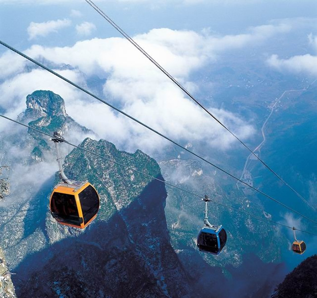 ②、張家界天門山索道為全世界最長(zhǎng)的觀光客運(yùn)索道,索道線路斜長(zhǎng)7455 米,索道運(yùn)行速度為每秒 6 米,單程運(yùn)行時(shí)間約28分鐘。上、下站水平高差1279米主要設(shè)備均由法國(guó)POMA公司原裝進(jìn)口,索道鋼繩來自于法國(guó), 98 個(gè)吊廂來自瑞士 CWA 公司,單個(gè)造價(jià)高達(dá) 20 萬元人民幣。有嚴(yán)重心臟病或恐高癥等患者不建議乘坐;