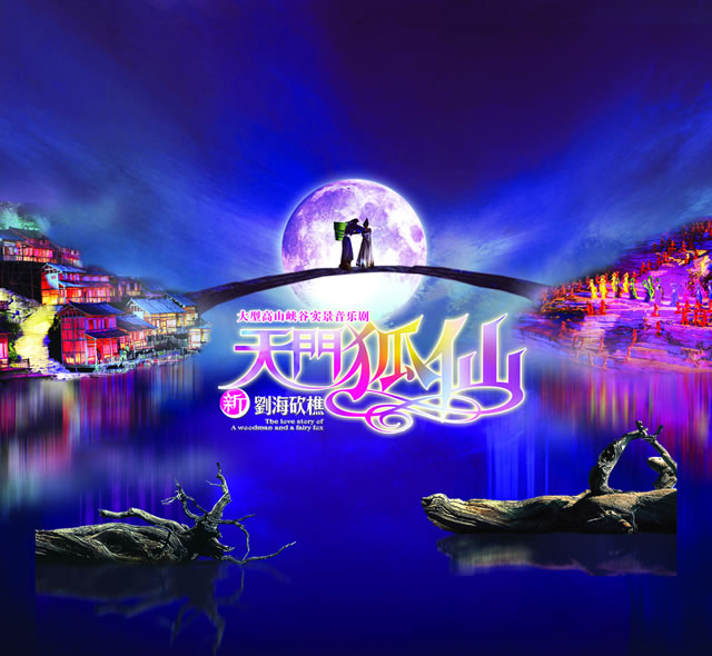 張家界大型山水實(shí)景音樂劇《天門狐仙——新劉海砍樵》于2009年9月17日晚正式開演”,世界第一臺(tái)大型山水實(shí)景音樂劇正式與國(guó)內(nèi)外觀眾見面。