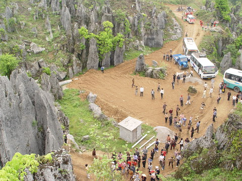登上洛塔,只見連山綿谷,萬石如林,一塊塊青灰色的大石頭競高競秀,競美競奇,綿亙縱橫,層疊交錯(cuò),造型奇特,塔狀、蓮臺(tái)狀、羅漢狀、錐狀、刀狀、箭簇狀、帷幕狀等林立薈萃,像一個(gè)個(gè)神奇的迷宮,組成洛塔地質(zhì)公園的旖旎景觀。有的玲瓏斫剔,若女繡工鐫;有的嶙峋怪異,如鬼斧神鑿;有的崢嶸巉峻,似水墨丹青;有的嵯峨兀立,藤蔓纏繞,更像一株株挺拔的古樹。高的、矮的、大的,細(xì)的。粗、瘦、皺、滑,各具特色,如人之面目相具而無一相似者,在綠樹紅花間亮麗起一道道迷人的風(fēng)景。洛塔石林遍及整個(gè)山界,較集中的有楠竹車水坪石林、梭洛趙家灣石林、八仙石林及公路沿線的銀河塔石林,僅車水坪一帶的石林面積就達(dá)1000多畝。無論其規(guī)模面積,造型及組合情況,洛塔石林都可與云南石林媲美。