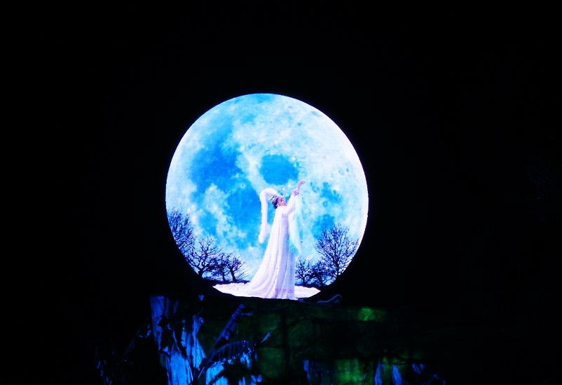 本項目觀眾劇場及主舞臺總占地面積19880平方米,其中全景舞臺10000平方米,采用玻璃鋼設計,通過燈光效果可通體透亮,營造出奇幻場景。整個表演區(qū)包括:中心舞臺、左側的人間世界,右側的狐貍世界、左前歌隊歌臺、后演區(qū)梯田與木橋實景共五個演區(qū)。