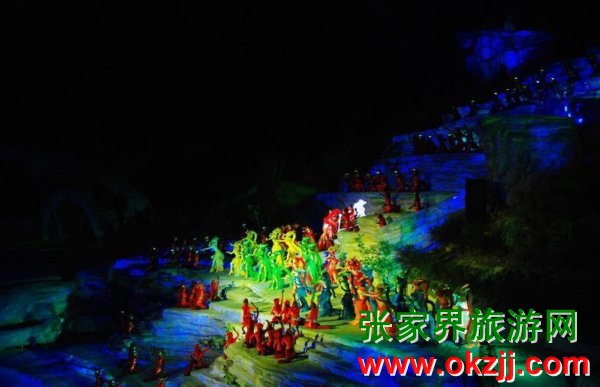 是目前世界第一臺有完整故事情節(jié)的山水實景音樂歌舞劇。舞臺選址在天門山風景區(qū)山門口內至天門山頂的整條峽谷,總投資達到1.2億元,演員隊伍達530多人。主舞臺以10000平米的玻璃鋼打造,是目前世界最大的全景玻璃鋼舞臺。