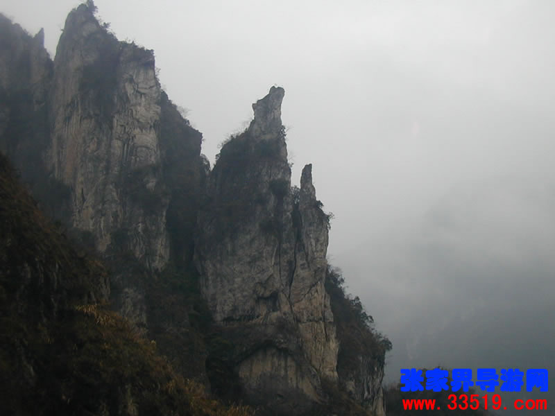 南天門——沿著河水一直往里走,在溪水最深處,可以仰望那隱藏在云霧里的南天門。它并不同于天門山的天門洞。它獨(dú)立于眾山之中,就像真正的通天大門,當(dāng)你翻過(guò)了前面的天門洞,卻還要再通過(guò)這座南天門,方可真正羽化登仙。南天門旁邊的幾座山峰,也都生的奇形怪狀,倒也天然形成了一個(gè)個(gè)大大小小的自然景觀。宛如天兵天將般守衛(wèi)南天門的將軍巖,象征南天門仙家氣息的蠟燭峰等,散落在四周,構(gòu)成了一個(gè)整體的山體奇觀。