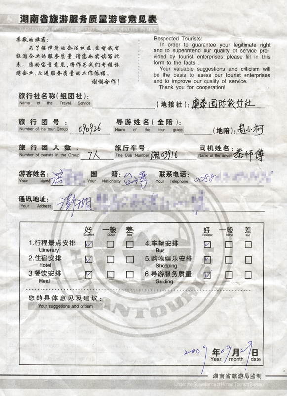 9月26日臺灣李洪先生一行7人接待質量反饋單: