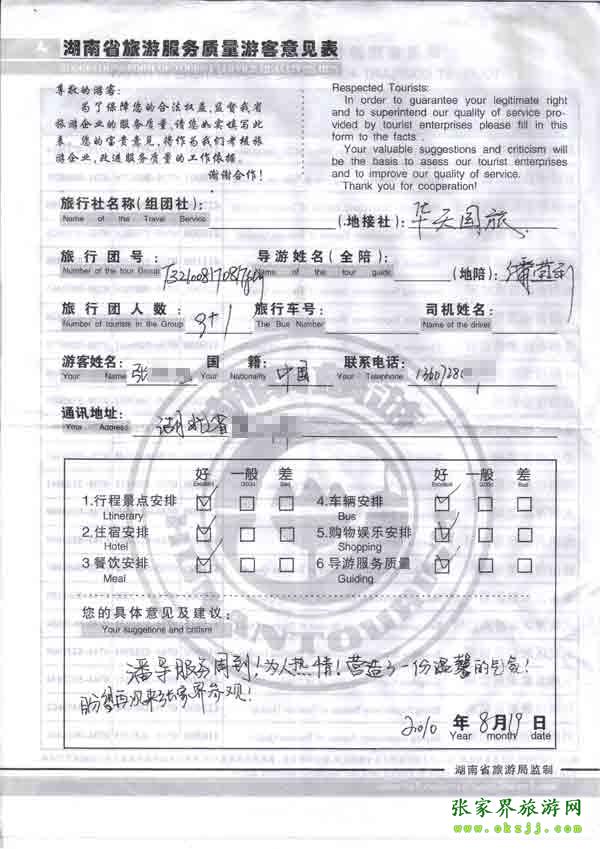 2010年8月19日湖北張先生一行九位旅游點(diǎn)評:導(dǎo)游服務(wù)周到熱情,盼下次再來張家界
