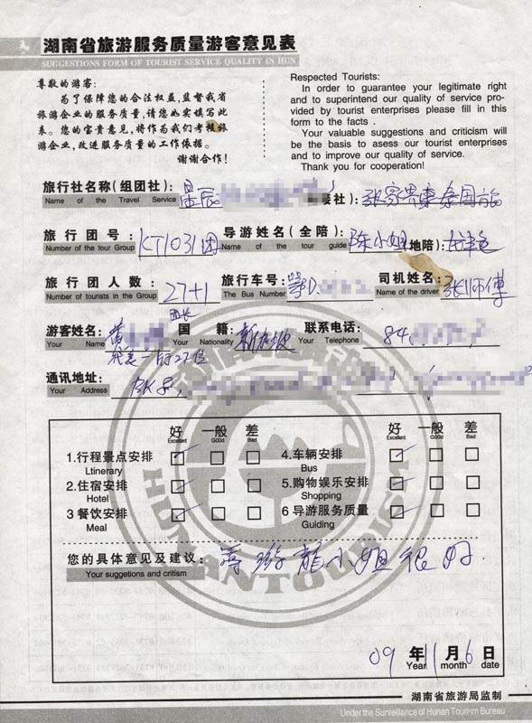 2009年10月31日新加坡黃先生一行27人旅游接待質量反饋單: