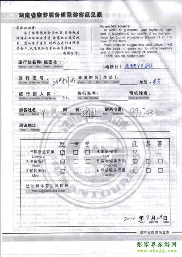 2010年8月29日鄧先生一行5位旅游質量反饋