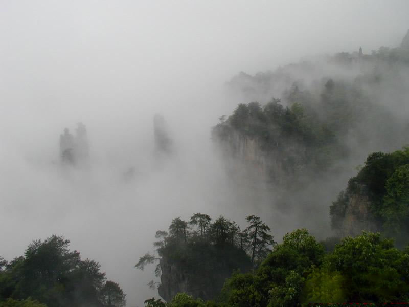 天子山還有云霧、月夜、霞日、冬雪四大奇觀。云霧,是天子山最多見的天象奇觀。有云霧、云海、云濤、云瀑和云彩等景象。久雨初晴之后或霏霏細(xì)雨之中,先是朦朧大霧,繼而形成白云,環(huán)繞飄浮。群峰在無邊無際的云海中時(shí)隱時(shí)現(xiàn),使人仿佛置身于蓬萊仙境之中。有時(shí)云霧從溪口涌出,爬過峰頂,然后以鋪天蓋地之勢,飛瀉而下,形成云瀑,十分壯觀。月夜,當(dāng)月明星稀,萬籟俱寂時(shí),這里的峰林被朦朧月色披上了一層“魔紗”,似一群群魔影聳立在幽谷之中。耳聞禽獸嚦嚦的叫聲,使人產(chǎn)生一種神秘感。霞日,晴天的早晨,一輪紅日在朵朵紅云的襯托下,從奇山異峰中冉冉升起。千萬座石塔,婷婷玉立,披上一層紅霞,十分迷人。冬雪,入冬,天子山銀裝素裹,青松和峰頂被大雪復(fù)蓋。此時(shí)的天子山冰柱倒立,冰花四散,只有一些山鹿、野豬,才不為銀白世界所征服。