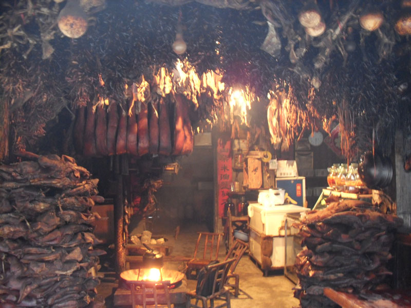 如果你想品嘗正宗的煙熏臘肉,還非得在張家界景區(qū)內吃。在景區(qū)內當?shù)厝碎_的小飯館里可以吃到被炭火烤得烏黑的香噴噴的臘肉,只要把外層洗掉就行了。這種臘肉在城里是不可能吃到的,它是在農家的灶上慢慢烤出來的。