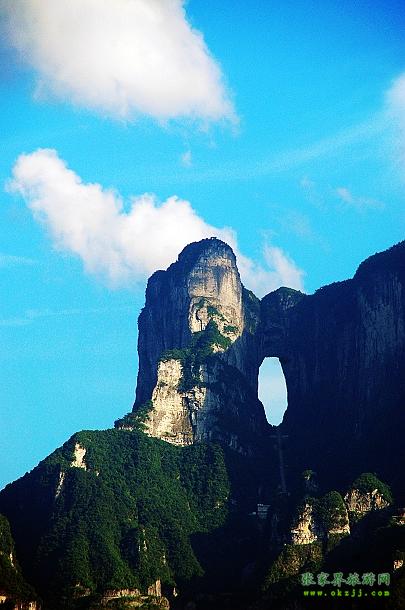 天門洞簡介 天門洞是天門山最具有代表意義的景點,它位于天門山山體的中上部,海拔1300米,門高131.5米,寬57米,深60米,是世界上最高海拔的天然穿山溶洞。 天門洞南北對開于千尋素壁之上,扶搖而通天,氣象變化萬千,似明鏡似天門鑲嵌于蔚蔚天幕之上,終年吞白云吐紫霧,渲染著神秘莫測的氣氛而更顯出塵脫俗,正所謂奪盡天地之造化,藏盡天地之玄機,而成為千古難解之謎,尋尋覓覓,終是難解。置身其間,宛如入身天宮帝閣一般,大有“我欲乘云仙飛去,直入九霄攬乾坤”之感。“天門洞開云氣通,江東峨眉皆下風(fēng)”元朝的著名詩人張兌曾這樣贊嘆,磅礴的氣勢由此可見。